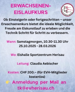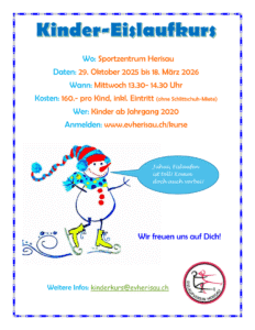 Vom 29.10.2025 bis 11.03.2026 bietet der EVH für alle eislaufbegeisterten Kinder einen Kinder-Eislaufkurs an. Der Kurs wird von unseren erfahrenen Leiterinnen durchgeführt und findet jeweils am Mittwoch von 13:30 – 14:30 Uhr im Sportzentrum Herisau statt.